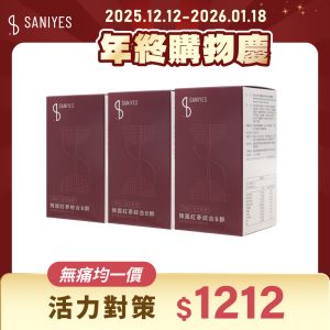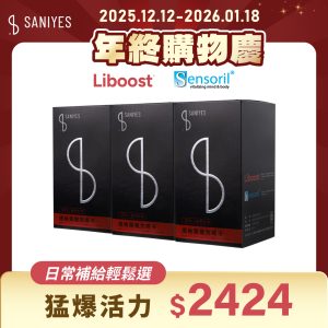 Previous slide Next slide 新品上市 促銷結束 01/16雙12限定✨【三效入手】韓國紅蔘綜合B群+葡萄籽萃取維生素C+高強化維生素D3NT$2,020 NT$1,212 加入購物車促銷結束 01/16雙12限定✨【活力對策】韓國紅蔘綜合B群/3入NT$2,100 NT$1,212 加入購物車促銷結束 01/16雙12限定✨【防禦對策】葡萄籽萃取維生素C /3入NT$2,160 NT$1,212 加入購物車促銷結束 01/16雙12限定✨【穩固加倍】奇蹟胜肽海藻鈣+高強化維生素D3NT$1,900 NT$1,212 加入購物車促銷結束 01/16雙12限定✨纖淨洛神葵奇亞籽果凍(黑醋栗口味)/3入NT$2,880 NT$1,212 加入購物車促銷結束 01/16雙12限定✨【日光對策】高強化維生素D3/3入NT$1,800 NT$1,212 加入購物車促銷結束 01/16雙12限定✨【潤妍對策】金絲燕窩膠原胜肽飲/3入NT$3,600 NT$1,212 加入購物車促銷結束 12/06雙12限定✨【熟齡健康/2組】奇蹟胜肽海藻鈣+美國專利游離型葉黃素NT$5,800 NT$2,424 加入購物車促銷結束 01/16雙12限定✨【青春怦潤/2組】金絲燕窩膠原胜肽飲+專利玄米神經醯胺余甘子NT$5,600 NT$2,424 加入購物車促銷結束 01/16雙12限定✨【循環補給】rTG 85%優質挪威魚油+專利薑黃白腎豆萃取NT$3,700 NT$2,424 加入購物車促銷結束 01/16雙12限定✨【飲控消化/2組】專利薑黃白腎豆萃取+專利秋葵綠茶萃取物(多酚)NT$7,400 NT$2,424 加入購物車促銷結束 01/16雙12限定✨【強悍對策】透納葉複方瑪卡/3入NT$4,500 NT$2,424 加入購物車 熱銷商品 【飲控消化組合】專利薑黃白腎豆萃取+專利秋葵綠茶萃取物(多酚)NT$3,700 NT$2,775 加入購物車雙12限定✨【晶亮對策】美國專利游離型葉黃素/10入促銷結束 01/16NT$16,000 NT$9,000 加入購物車【舒眠對策】GABA芝麻素海水鎂3入NT$5,160 NT$4,025 加入購物車【純淨對策】rTG 85%優質挪威魚油NT$1,600 NT$1,300 加入購物車【舒眠對策】GABA芝麻素海水鎂NT$1,720 NT$1,430 加入購物車雙12限定✨【順暢對策】專利機能益生菌/10入促銷結束 01/16NT$16,000 NT$9,000 加入購物車【純淨對策】rTG 85%優質挪威魚油3入NT$4,800 NT$3,744 加入購物車【穩固對策】奇蹟胜肽海藻鈣NT$1,300 NT$1,080 加入購物車【純淨對策】rTG 85%優質挪威魚油5入NT$8,000 NT$6,000 加入購物車【穩固對策】奇蹟胜肽海藻鈣5入NT$6,500 NT$4,875 加入購物車纖淨洛神葵奇亞籽果凍(黑醋栗口味)NT$960 NT$799 加入購物車【晶亮對策】美國專利游離型葉黃素5入NT$8,000 NT$6,000 加入購物車 專科醫師推薦 推薦商品 SANIYES【順暢對策】 專利機能益生菌 台美日專利菌株 + 專利綜合消化酵素調整體質、幫助消化、排便順暢 瞭解更多 SANIYES【舒眠對策】 GABA芝麻素海水鎂 韓國專利授權GABA + 日本芝麻素幫助入睡好眠配方!多項輔助複方升級 瞭解更多 推薦商品 SANIYES【順暢對策】專利機能益生菌 台美日專利菌株 + 專利綜合消化酵素,調整體質、幫助消化、排便順暢。 SANIYES【舒眠對策】GABA芝麻素海水鎂 韓國專利授權GABA + 日本芝麻素,幫助入睡好眠配方!多項輔助複方升級。 推薦商品 SANIYES【順暢對策】專利機能益生菌 台美日專利菌株 + 專利綜合消化酵素,調整體質、幫助消化、排便順暢。 SANIYES【舒眠對策】GABA芝麻素海水鎂 韓國專利授權GABA及日本芝麻素,幫助入睡好眠配方!多項輔助複方升級。 會員招募 健康YES 怎麼挑益生菌?關鍵重點有哪些?為什麼要選膠囊的? 近幾年「益生菌」在市場上非常熱門,不只許多學術論文… 閱讀全文 膠原蛋白怎麼吃?為何要選擇添加維生素C的膠原蛋白飲? 您同樣也是常常會留意自身肌膚狀況的 「愛美族」嗎?… 閱讀全文 GABA 是什麼呢?為何 GABA 能幫助入睡? 你也有半夜數羊數不完的經驗嗎?現代社會工作壓力大… 閱讀全文