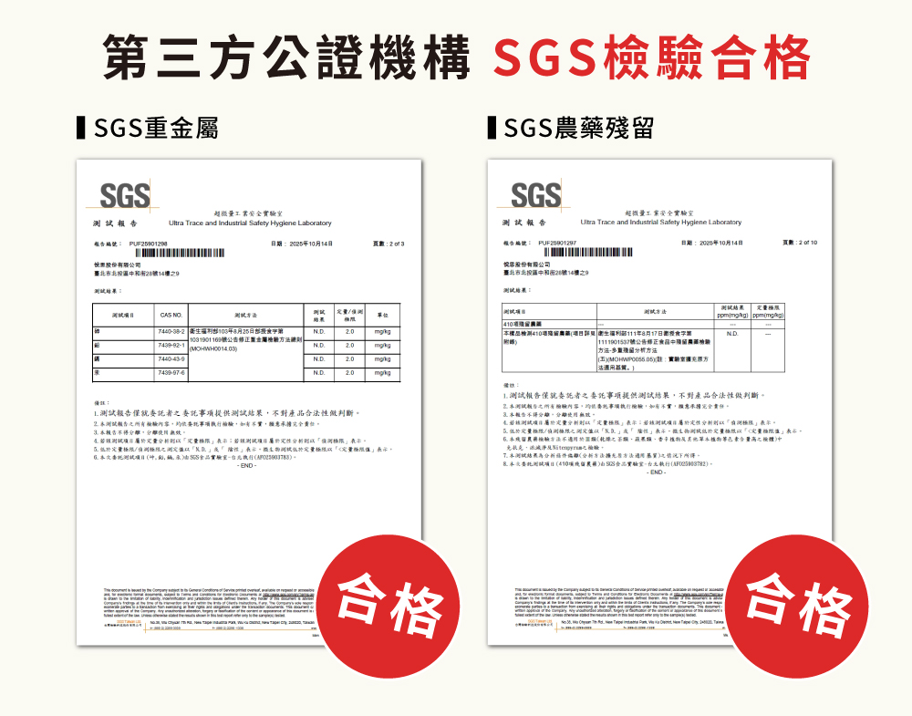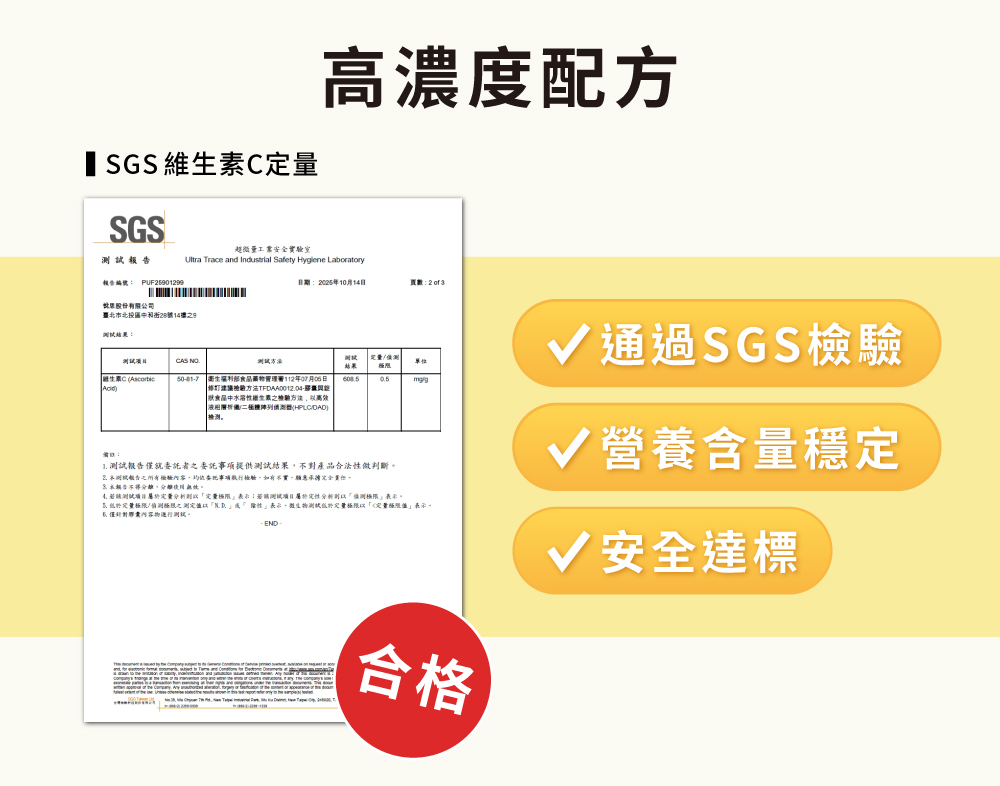 - 安心認證 | SGS維生素C定量、重金屬、農藥殘留410項逐批檢測,檢驗合格